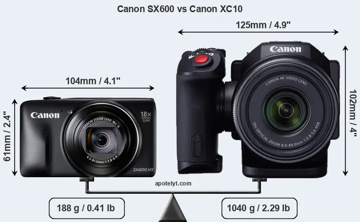 If the front view area (width x height) of the cameras is taken as an aggregate measure of their size, the Canon XC10 is considerably larger (101 percent) than the Canon SX600. Moreover, the XC10 is substantially heavier (453 percent) than the SX600. In this context, it is worth noting that neither the SX600 nor the XC10 are weather-sealed.