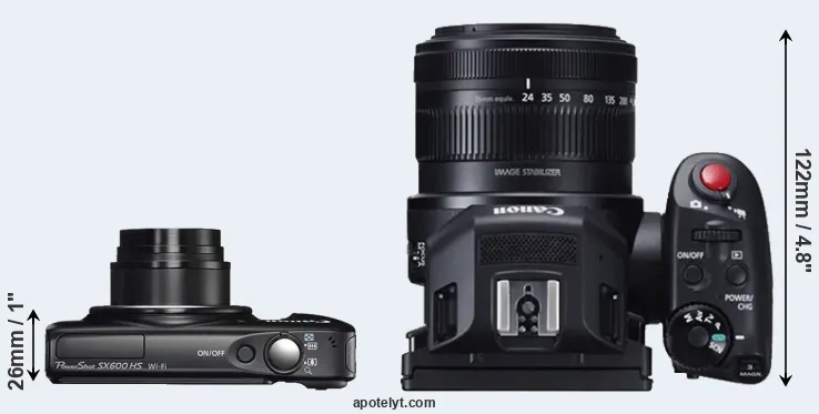 An illustration of the physical size and weight of the Canon SX600 and the Canon XC10 is provided in the side-by-side display below. The two cameras are presented according to their relative size. Three consecutive views from the front, the top, and the rear side are shown. All size dimensions are rounded to the nearest millimeter.