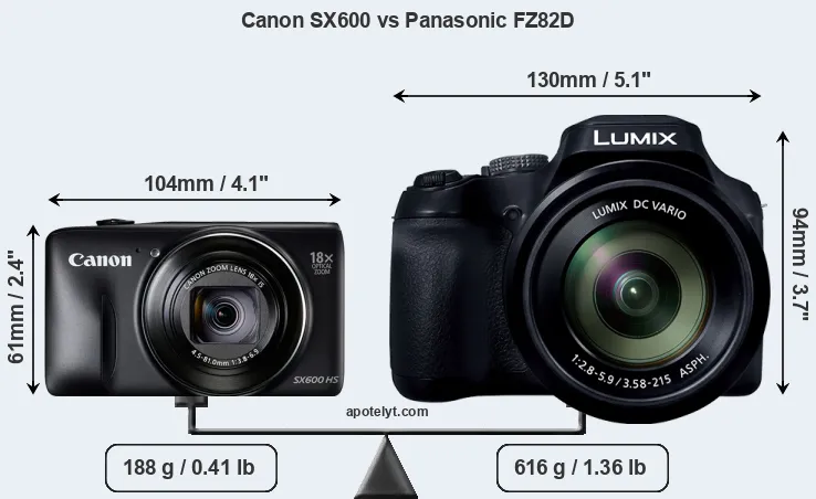 If the front view area (width x height) of the cameras is taken as an aggregate measure of their size, the Panasonic FZ82D is considerably larger (93 percent) than the Canon SX600. Moreover, the FZ82D is substantially heavier (228 percent) than the SX600. In this context, it is worth noting that neither the SX600 nor the FZ82D are weather-sealed.