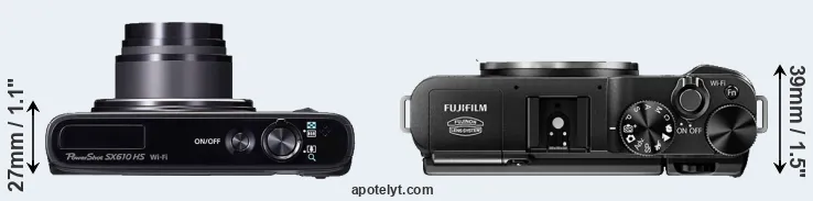 If the front view area (width x height) of the cameras is taken as an aggregate measure of their size, the Fujifilm X-M1 is notably larger (22 percent) than the Canon SX610. In this context, it is worth noting that neither the SX610 nor the X-M1 are weather-sealed.