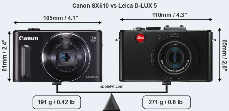 If the front view area (width x height) of the cameras is taken as an aggregate measure of their size, the Leica D-LUX 5 is notably larger (12 percent) than the Canon SX610. Moreover, the D-LUX 5 is substantially heavier (42 percent) than the SX610. In this context, it is worth noting that neither the SX610 nor the D-LUX 5 are weather-sealed.