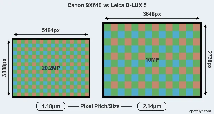 Despite having a smaller sensor, the Canon SX610 offers a higher resolution of 20.2 megapixels, compared with 10 MP of the Leica D-LUX 5. This megapixels advantage comes at the cost of a higher pixel density and a smaller size of the individual pixel (with a pixel pitch of 1.18μm versus 2.14μm for the D-LUX 5). However, it should be noted that the SX610 is much more recent (by 4 years and 3 months) than the D-LUX 5, and its sensor will have benefitted from technological advances during this time that make it possible to gather light more efficiently. Coming back to sensor resolution, it should be mentioned that the SX610 has no anti-alias filter installed, so that it can capture all the detail its sensor resolves.