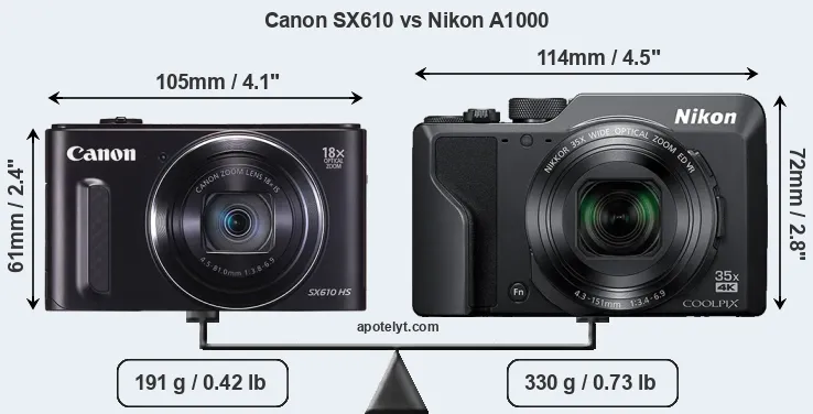 The side-by-side display below illustrates the physical size and weight of the Canon SX610 and the Nikon A1000. The two cameras are presented according to their relative size. Three successive views from the front, the top, and the rear are shown. All width, height and depth dimensions are rounded to the nearest millimeter.