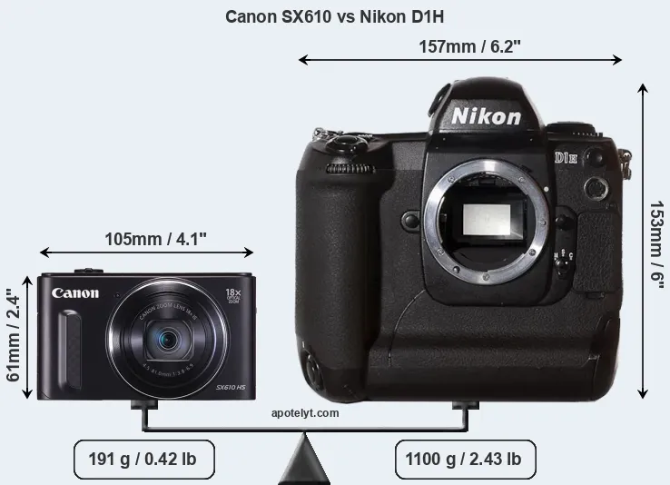 The side-by-side display below illustrates the physical size and weight of the Canon SX610 and the Nikon D1H. The two cameras are presented according to their relative size. Three consecutive perspectives from the front, the top, and the back are available. All size dimensions are rounded to the nearest millimeter.