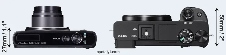 The side-by-side display below illustrates the physical size and weight of the Canon SX610 and the Sony A6400. The two cameras are presented according to their relative size. Three successive views from the front, the top, and the rear are shown. All size dimensions are rounded to the nearest millimeter.