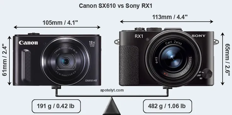 If the front view area (width x height) of the cameras is taken as an aggregate measure of their size, the Sony RX1 is notably larger (15 percent) than the Canon SX610. Moreover, the RX1 is substantially heavier (152 percent) than the SX610. In this context, it is worth noting that neither the SX610 nor the RX1 are weather-sealed.