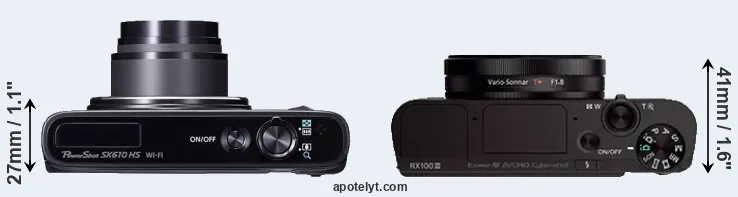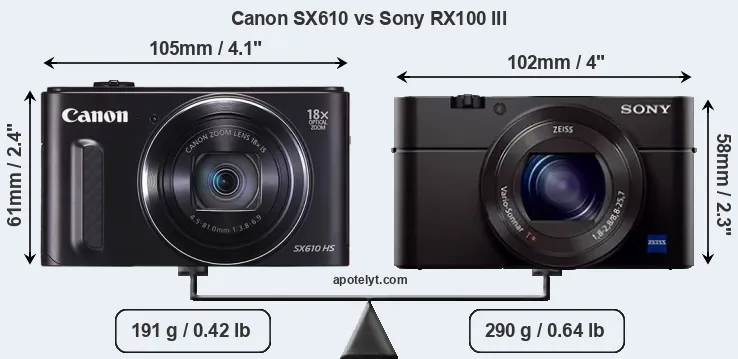 An illustration of the physical size and weight of the Canon SX610 and the Sony RX100 III is provided in the side-by-side display below. The two cameras are presented according to their relative size. Three consecutive perspectives from the front, the top, and the back are available. All width, height and depth measures are rounded to the nearest millimeter.