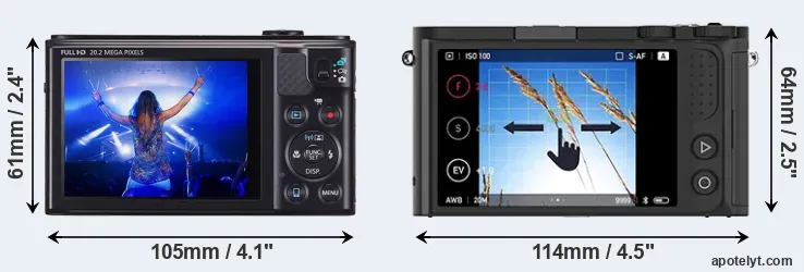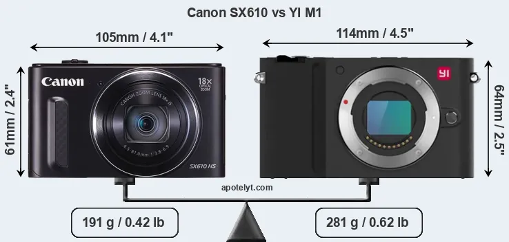 An illustration of the physical size and weight of the Canon SX610 and the YI M1 is provided in the side-by-side display below. The two cameras are presented according to their relative size. Three successive views from the front, the top, and the rear are shown. All width, height and depth dimensions are rounded to the nearest millimeter.