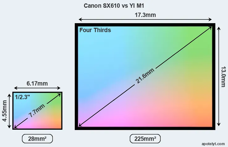 Of the two cameras under consideration, the Canon SX610 features a 1/2.3-inch sensor and the YI M1 a Four Thirds sensor. The sensor area in the M1 is 704 percent bigger. As a result of these sensor size differences, the cameras have a format factor of, respectively, 5.6 and 2.0. Both cameras feature a native aspect ratio (sensor width to sensor height) of 4:3.