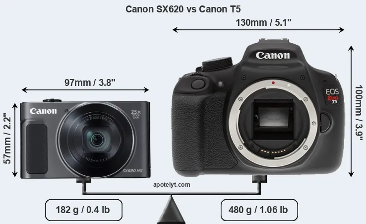 The physical size and weight of the Canon SX620 and the Canon T5 are illustrated in the side-by-side display below. The two cameras are presented according to their relative size. Three successive views from the front, the top, and the rear are shown. All width, height and depth measures are rounded to the nearest millimeter.
