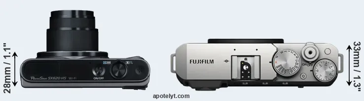 The side-by-side display below illustrates the physical size and weight of the Canon SX620 and the Fujifilm X-E4. The two cameras are presented according to their relative size. Three consecutive views from the front, the top, and the rear side are shown. All width, height and depth dimensions are rounded to the nearest millimeter.