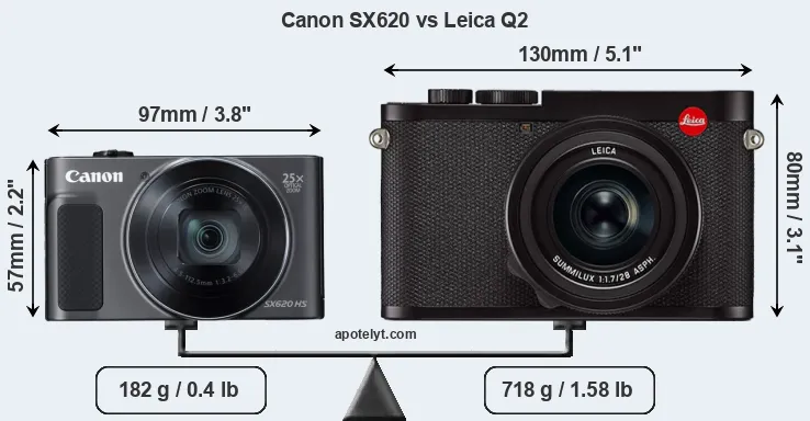 If the front view area (width x height) of the cameras is taken as an aggregate measure of their size, the Leica Q2 is considerably larger (88 percent) than the Canon SX620. Moreover, the Q2 is substantially heavier (295 percent) than the SX620. It is noteworthy in this context that the Q2 is splash and dust-proof, while the SX620 does not feature any corresponding weather-sealing.