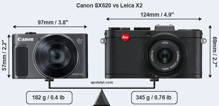 If the front view area (width x height) of the cameras is taken as an aggregate measure of their size, the Leica X2 is considerably larger (55 percent) than the Canon SX620. Moreover, the X2 is substantially heavier (90 percent) than the SX620. In this context, it is worth noting that neither the SX620 nor the X2 are weather-sealed.