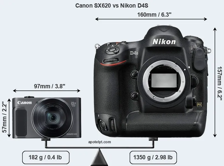 If the front view area (width x height) of the cameras is taken as an aggregate measure of their size, the Nikon D4S is considerably larger (354 percent) than the Canon SX620. It is noteworthy in this context that the D4S is splash and dust-proof, while the SX620 does not feature any corresponding weather-sealing.