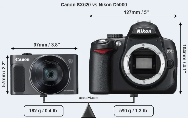 The side-by-side display below illustrates the physical size and weight of the Canon SX620 and the Nikon D5000. The two cameras are presented according to their relative size. Three successive views from the front, the top, and the rear are shown. All width, height and depth dimensions are rounded to the nearest millimeter.