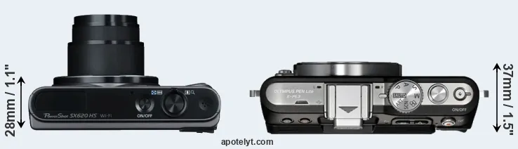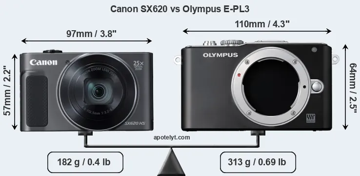 The side-by-side display below illustrates the physical size and weight of the Canon SX620 and the Olympus E-PL3. The two cameras are presented according to their relative size. Three consecutive perspectives from the front, the top, and the back are available. All width, height and depth dimensions are rounded to the nearest millimeter.