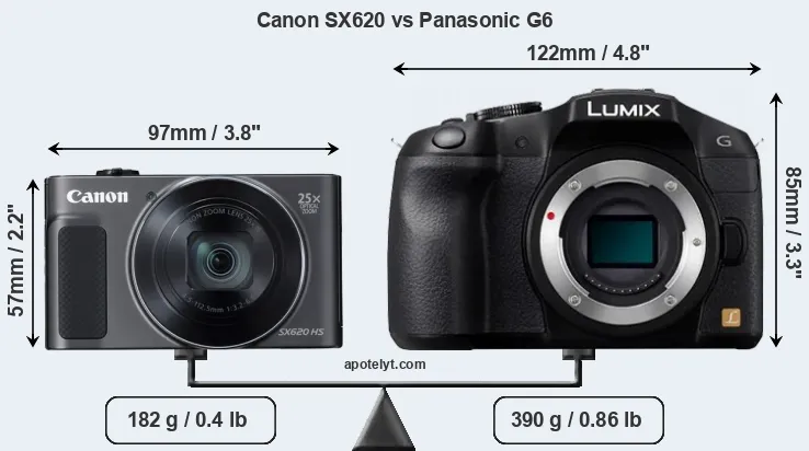 The side-by-side display below illustrates the physical size and weight of the Canon SX620 and the Panasonic G6. The two cameras are presented according to their relative size. Three successive views from the front, the top, and the rear are shown. All width, height and depth dimensions are rounded to the nearest millimeter.