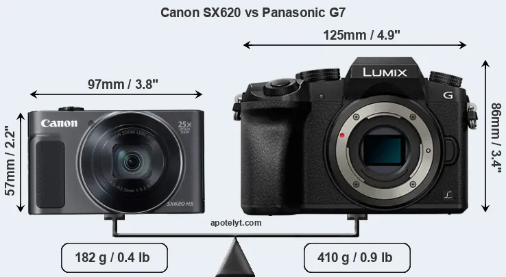 The physical size and weight of the Canon SX620 and the Panasonic G7 are illustrated in the side-by-side display below. The two cameras are presented according to their relative size. Three consecutive perspectives from the front, the top, and the back are available. All size dimensions are rounded to the nearest millimeter.