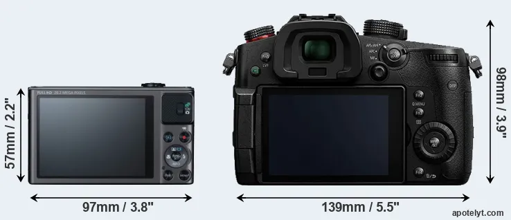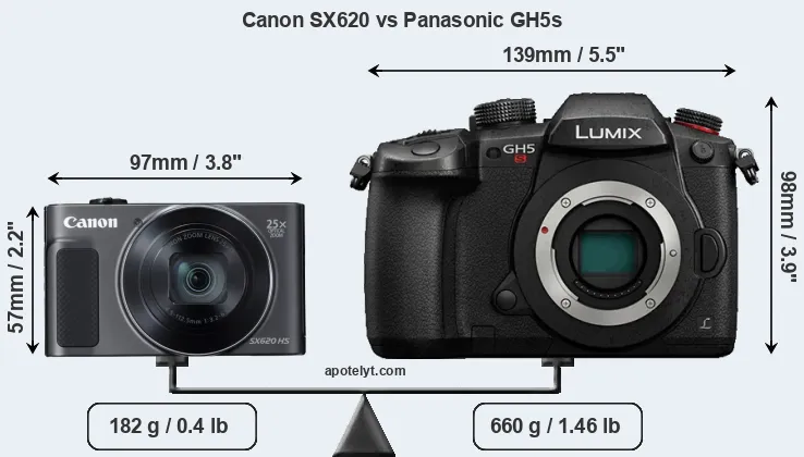 If the front view area (width x height) of the cameras is taken as an aggregate measure of their size, the Panasonic GH5s is considerably larger (146 percent) than the Canon SX620. It is noteworthy in this context that the GH5s is splash and dust-proof, while the SX620 does not feature any corresponding weather-sealing.