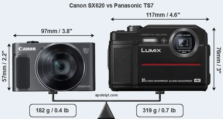 The side-by-side display below illustrates the physical size and weight of the Canon SX620 and the Panasonic TS7. The two cameras are presented according to their relative size. Three consecutive perspectives from the front, the top, and the back are available. All width, height and depth dimensions are rounded to the nearest millimeter.