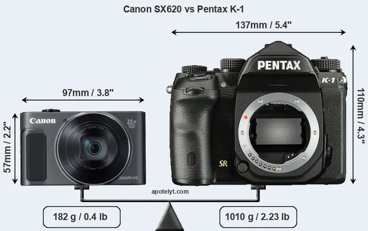 If the front view area (width x height) of the cameras is taken as an aggregate measure of their size, the Pentax K-1 is considerably larger (173 percent) than the Canon SX620. It is noteworthy in this context that the K-1 is splash and dust-proof, while the SX620 does not feature any corresponding weather-sealing.