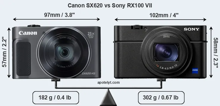 If the front view area (width x height) of the cameras is taken as an aggregate measure of their size, the Sony RX100 VII is notably larger (7 percent) than the Canon SX620. Moreover, the RX100 VII is substantially heavier (66 percent) than the SX620. In this context, it is worth noting that neither the SX620 nor the RX100 VII are weather-sealed.