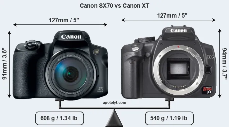 An illustration of the physical size and weight of the Canon SX70 and the Canon XT is provided in the side-by-side display below. The two cameras are presented according to their relative size. Three consecutive perspectives from the front, the top, and the back are available. All width, height and depth dimensions are rounded to the nearest millimeter.