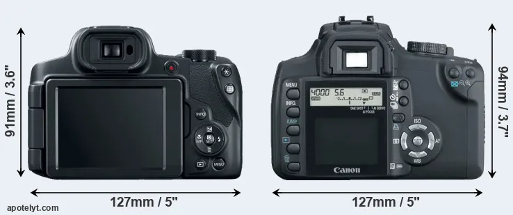 Of the two cameras under consideration, the Canon SX70 features a 1/2.3-inch sensor and the Canon XT an APS-C sensor. The sensor area in the XT is 1075 percent bigger. As a result of these sensor size differences, the cameras have a format factor of, respectively, 5.6 and 1.6. The sensor in the SX70 has a native 4:3 aspect ratio, while the one in the XT offers a 3:2 aspect.