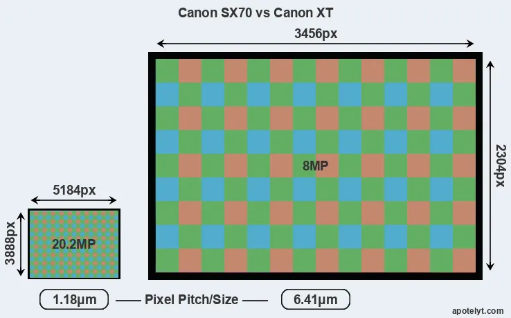 Despite having a smaller sensor, the Canon SX70 offers a higher resolution of 20.2 megapixels, compared with 8 MP of the Canon XT. This megapixels advantage comes at the cost of a higher pixel density and a smaller size of the individual pixel (with a pixel pitch of 1.18μm versus 6.41μm for the XT). However, it should be noted that the SX70 is much more recent (by 13 years and 7 months) than the XT, and its sensor will have benefitted from technological advances during this time that make it possible to gather light more efficiently. Coming back to sensor resolution, it should be mentioned that the SX70 has no anti-alias filter installed, so that it can capture all the detail its sensor resolves.