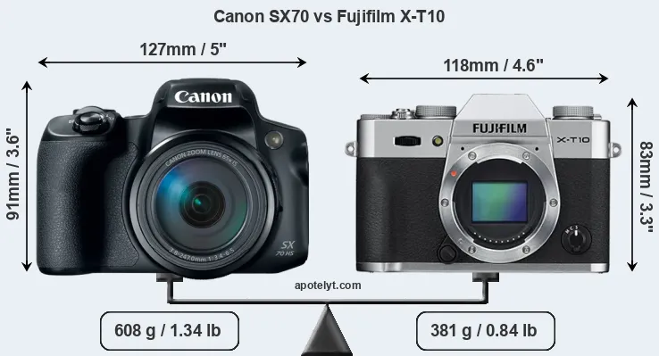 The side-by-side display below illustrates the physical size and weight of the Canon SX70 and the Fujifilm X-T10. The two cameras are presented according to their relative size. Three successive views from the front, the top, and the rear are shown. All size dimensions are rounded to the nearest millimeter.