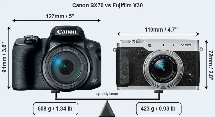 The physical size and weight of the Canon SX70 and the Fujifilm X30 are illustrated in the side-by-side display below. The two cameras are presented according to their relative size. Three successive views from the front, the top, and the rear are shown. All size dimensions are rounded to the nearest millimeter.
