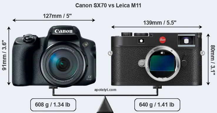 If the front view area (width x height) of the cameras is taken as an aggregate measure of their size, the Leica M11 is somewhat smaller (4 percent) than the Canon SX70. It is noteworthy in this context that the M11 is splash and dust-proof, while the SX70 does not feature any corresponding weather-sealing.