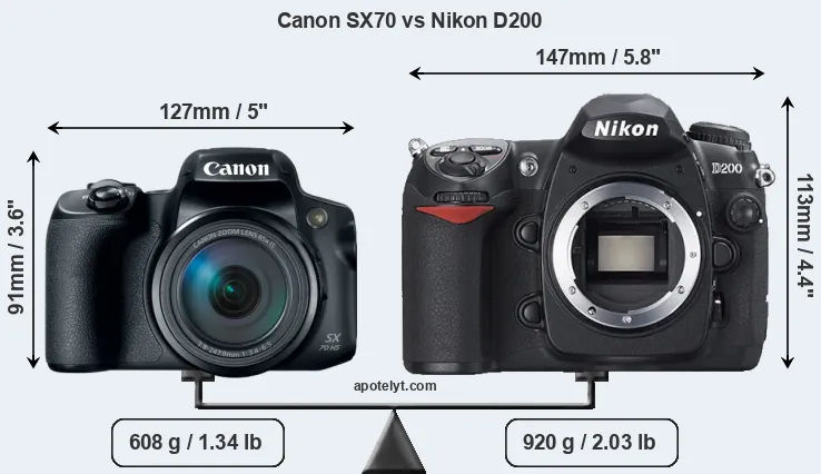 The physical size and weight of the Canon SX70 and the Nikon D200 are illustrated in the side-by-side display below. The two cameras are presented according to their relative size. Three successive views from the front, the top, and the rear are shown. All width, height and depth measures are rounded to the nearest millimeter.