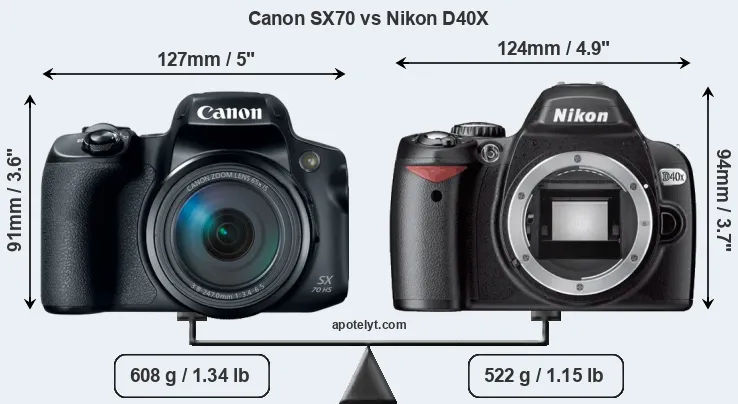 The side-by-side display below illustrates the physical size and weight of the Canon SX70 and the Nikon D40X. The two cameras are presented according to their relative size. Three consecutive views from the front, the top, and the rear side are shown. All width, height and depth dimensions are rounded to the nearest millimeter.