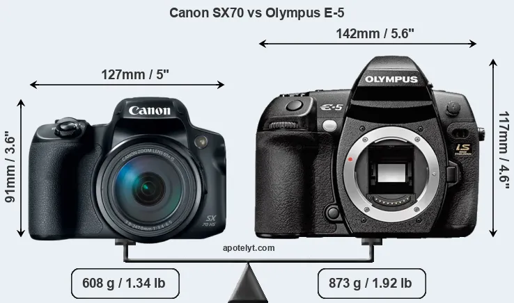 The above size and weight comparisons are to some extent incomplete and possibly misleading, as the SX70 has a lens built in, whereas the E-5 is an interchangeable lens camera that requires a separate lens. Attaching the latter will add extra weight and bulk to the setup. You can compare the optics available for the E-5 and their specifications in the Four Thirds Lens Catalog.