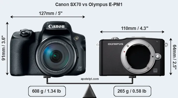 The side-by-side display below illustrates the physical size and weight of the Canon SX70 and the Olympus E-PM1. The two cameras are presented according to their relative size. Three consecutive perspectives from the front, the top, and the back are available. All size dimensions are rounded to the nearest millimeter.