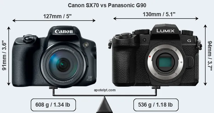 An illustration of the physical size and weight of the Canon SX70 and the Panasonic G90 is provided in the side-by-side display below. The two cameras are presented according to their relative size. Three successive views from the front, the top, and the rear are shown. All width, height and depth dimensions are rounded to the nearest millimeter.