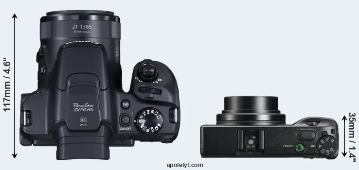 The physical size and weight of the Canon SX70 and the Ricoh GR IIIx are illustrated in the side-by-side display below. The two cameras are presented according to their relative size. Three consecutive views from the front, the top, and the rear side are shown. All size dimensions are rounded to the nearest millimeter.