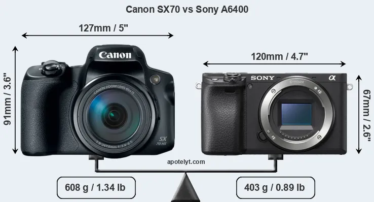 The side-by-side display below illustrates the physical size and weight of the Canon SX70 and the Sony A6400. The two cameras are presented according to their relative size. Three consecutive perspectives from the front, the top, and the back are available. All width, height and depth dimensions are rounded to the nearest millimeter.