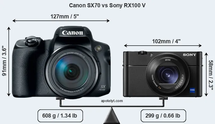 If the front view area (width x height) of the cameras is taken as an aggregate measure of their size, the Sony RX100 V is considerably smaller (49 percent) than the Canon SX70. Moreover, the RX100 V is substantially lighter (51 percent) than the SX70. In this context, it is worth noting that neither the SX70 nor the RX100 V are weather-sealed.