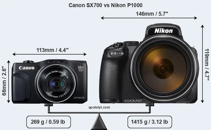 An illustration of the physical size and weight of the Canon SX700 and the Nikon P1000 is provided in the side-by-side display below. The two cameras are presented according to their relative size. Three consecutive perspectives from the front, the top, and the back are available. All width, height and depth measures are rounded to the nearest millimeter.