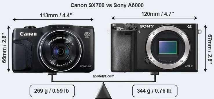 The side-by-side display below illustrates the physical size and weight of the Canon SX700 and the Sony A6000. The two cameras are presented according to their relative size. Three successive views from the front, the top, and the rear are shown. All width, height and depth measures are rounded to the nearest millimeter.