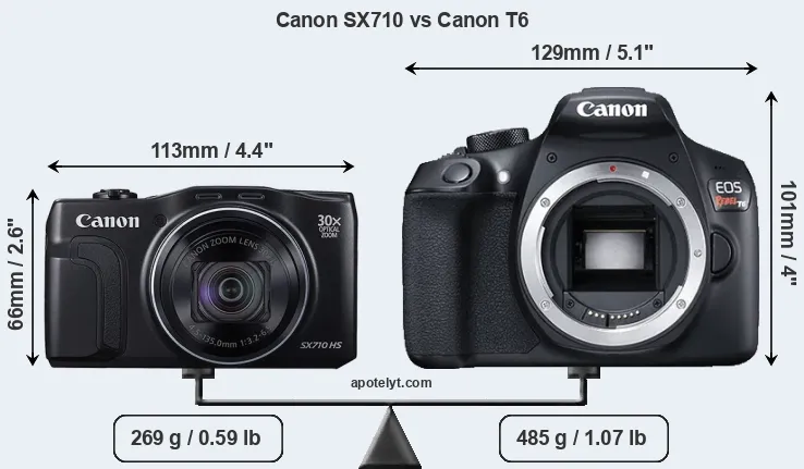 The physical size and weight of the Canon SX710 and the Canon T6 are illustrated in the side-by-side display below. The two cameras are presented according to their relative size. Three consecutive views from the front, the top, and the rear side are shown. All width, height and depth dimensions are rounded to the nearest millimeter.