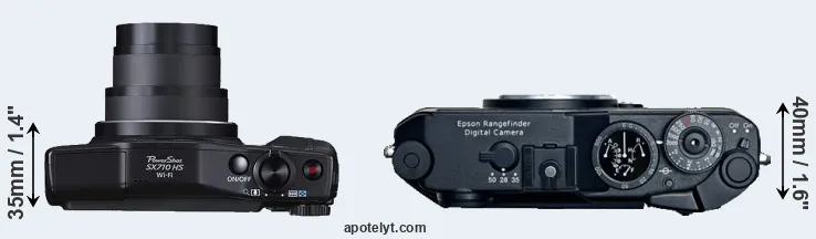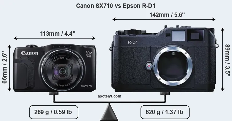 Going beyond this snapshot of core features and characteristics, what are the differences between the Canon PowerShot SX710 HS and the Epson R-D1? Which one should you buy? Read on to find out how these two cameras compare with respect to their body size, their imaging sensors, their shooting features, their input-output connections, and their reception by expert reviewers.