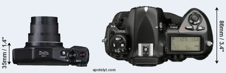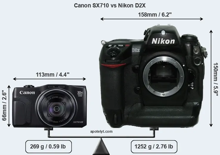 An illustration of the physical size and weight of the Canon SX710 and the Nikon D2X is provided in the side-by-side display below. The two cameras are presented according to their relative size. Three successive views from the front, the top, and the rear are shown. All width, height and depth measures are rounded to the nearest millimeter.