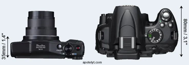 The physical size and weight of the Canon SX710 and the Nikon D5000 are illustrated in the side-by-side display below. The two cameras are presented according to their relative size. Three consecutive views from the front, the top, and the rear side are shown. All size dimensions are rounded to the nearest millimeter.