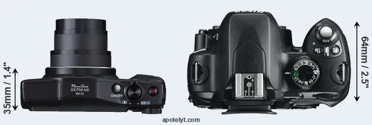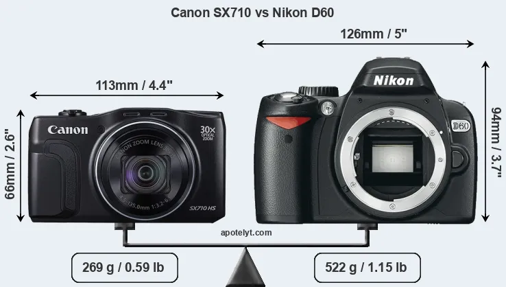 The side-by-side display below illustrates the physical size and weight of the Canon SX710 and the Nikon D60. The two cameras are presented according to their relative size. Three consecutive perspectives from the front, the top, and the back are available. All width, height and depth dimensions are rounded to the nearest millimeter.