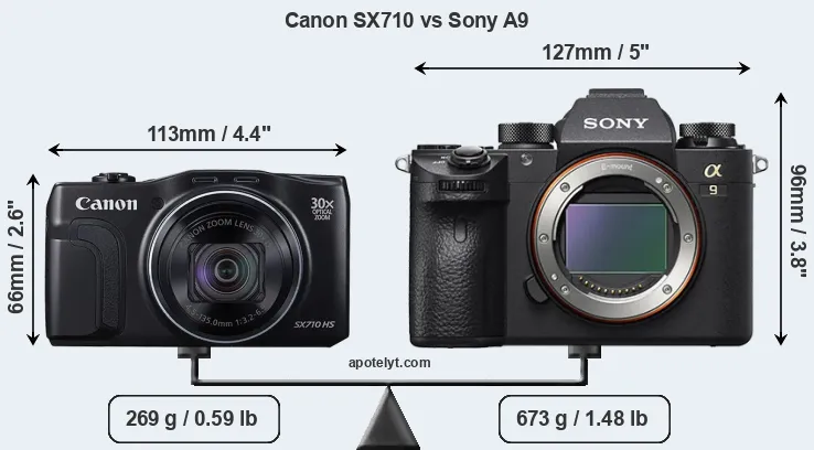 The side-by-side display below illustrates the physical size and weight of the Canon SX710 and the Sony A9. The two cameras are presented according to their relative size. Three consecutive perspectives from the front, the top, and the back are available. All width, height and depth dimensions are rounded to the nearest millimeter.