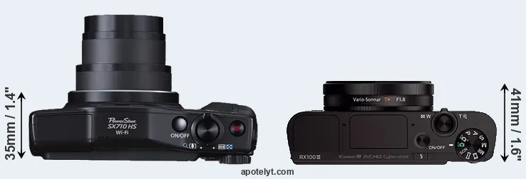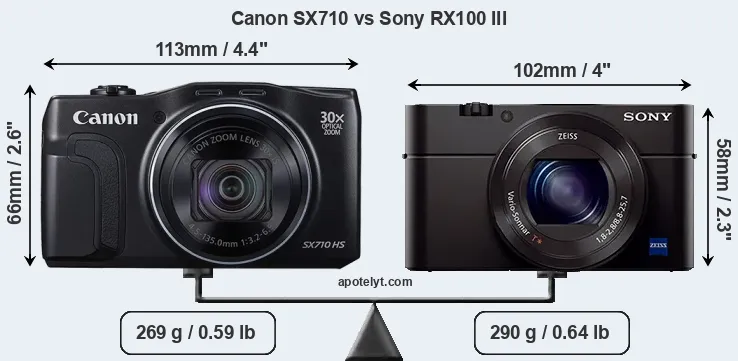 The side-by-side display below illustrates the physical size and weight of the Canon SX710 and the Sony RX100 III. The two cameras are presented according to their relative size. Three consecutive views from the front, the top, and the rear side are shown. All width, height and depth dimensions are rounded to the nearest millimeter.