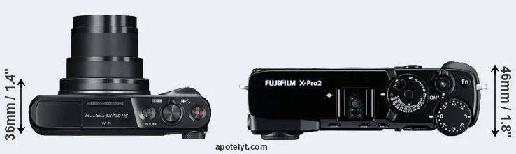 The side-by-side display below illustrates the physical size and weight of the Canon SX720 and the Fujifilm X-Pro2. The two cameras are presented according to their relative size. Three consecutive views from the front, the top, and the rear side are shown. All width, height and depth measures are rounded to the nearest millimeter.